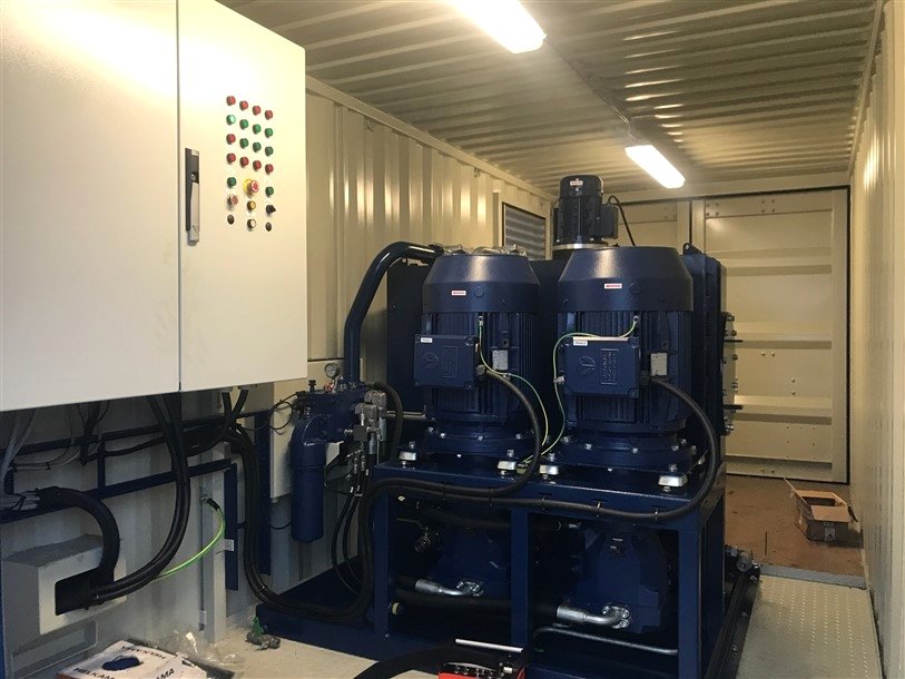 For a Belgium based civil engineering contractor we engineered and supplied the complete hydraulic drive & control of 4 spud poles for a new built work pontoon . The hydraulic power pack is installed inside a 20ft container. The system is operated by means of a radio remote control. In addition, every spud pole can be manually operated locally. We also took care of the installation, including stainless steel piping and hoses.